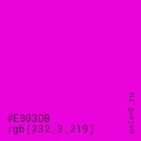 Цвет #E803DB в цветовой модели RGB обозначается тремя октетами (232, 3, 219) в десятичном формате и #E803DB в шестнадцатиричном (hex) формате, которые являются интенсивностью красного 232 (hex E8), интенсивность зелёного 3 (hex 03) и интенсивность синего 219 (hex DB).