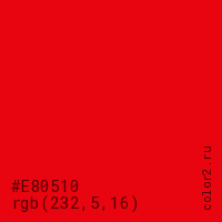 Цвет #E80510 в цветовой модели RGB обозначается тремя октетами (232, 5, 16) в десятичном формате и #E80510 в шестнадцатиричном (hex) формате, которые являются интенсивностью красного 232 (hex E8), интенсивность зелёного 5 (hex 05) и интенсивность синего 16 (hex 10).