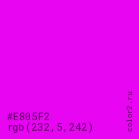 Цвет #E805F2 в цветовой модели RGB обозначается тремя октетами (232, 5, 242) в десятичном формате и #E805F2 в шестнадцатиричном (hex) формате, которые являются интенсивностью красного 232 (hex E8), интенсивность зелёного 5 (hex 05) и интенсивность синего 242 (hex F2).