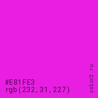 Цвет RGB(232, 31, 227) в процентом отношении количества цвета состоит из 91% красного (red), 12.2% зелёного (green) и 89% синего (blue).