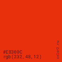 Цвет #E8300C в цветовой модели RGB обозначается тремя октетами (232, 48, 12) в десятичном формате и #E8300C в шестнадцатиричном (hex) формате, которые являются интенсивностью красного 232 (hex E8), интенсивность зелёного 48 (hex 30) и интенсивность синего 12 (hex 0C).