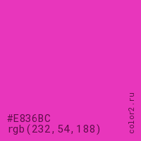 Цвет #E836BC в цветовой модели RGB обозначается тремя октетами (232, 54, 188) в десятичном формате и #E836BC в шестнадцатиричном (hex) формате, которые являются интенсивностью красного 232 (hex E8), интенсивность зелёного 54 (hex 36) и интенсивность синего 188 (hex BC).