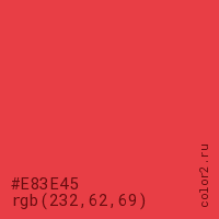 Цвет #E83E45 в цветовой модели RGB обозначается тремя октетами (232, 62, 69) в десятичном формате и #E83E45 в шестнадцатиричном (hex) формате, которые являются интенсивностью красного 232 (hex E8), интенсивность зелёного 62 (hex 3E) и интенсивность синего 69 (hex 45).