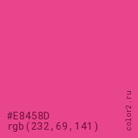 Цвет #E8458D в цветовой модели RGB обозначается тремя октетами (232, 69, 141) в десятичном формате и #E8458D в шестнадцатиричном (hex) формате, которые являются интенсивностью красного 232 (hex E8), интенсивность зелёного 69 (hex 45) и интенсивность синего 141 (hex 8D).