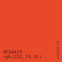 Цвет #E84A29 в цветовой модели RGB обозначается тремя октетами (232, 74, 41) в десятичном формате и #E84A29 в шестнадцатиричном (hex) формате, которые являются интенсивностью красного 232 (hex E8), интенсивность зелёного 74 (hex 4A) и интенсивность синего 41 (hex 29).