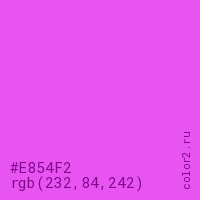 Цвет #E854F2 в цветовой модели RGB обозначается тремя октетами (232, 84, 242) в десятичном формате и #E854F2 в шестнадцатиричном (hex) формате, которые являются интенсивностью красного 232 (hex E8), интенсивность зелёного 84 (hex 54) и интенсивность синего 242 (hex F2).