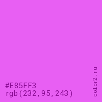 Цвет #E85FF3 в цветовой модели RGB обозначается тремя октетами (232, 95, 243) в десятичном формате и #E85FF3 в шестнадцатиричном (hex) формате, которые являются интенсивностью красного 232 (hex E8), интенсивность зелёного 95 (hex 5F) и интенсивность синего 243 (hex F3).