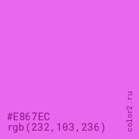 Цвет #E867EC в цветовой модели RGB обозначается тремя октетами (232, 103, 236) в десятичном формате и #E867EC в шестнадцатиричном (hex) формате, которые являются интенсивностью красного 232 (hex E8), интенсивность зелёного 103 (hex 67) и интенсивность синего 236 (hex EC).