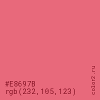 Цвет #E8697B в цветовой модели RGB обозначается тремя октетами (232, 105, 123) в десятичном формате и #E8697B в шестнадцатиричном (hex) формате, которые являются интенсивностью красного 232 (hex E8), интенсивность зелёного 105 (hex 69) и интенсивность синего 123 (hex 7B).