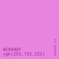 Цвет #E884DF в цветовой модели RGB обозначается тремя октетами (232, 132, 223) в десятичном формате и #E884DF в шестнадцатиричном (hex) формате, которые являются интенсивностью красного 232 (hex E8), интенсивность зелёного 132 (hex 84) и интенсивность синего 223 (hex DF).