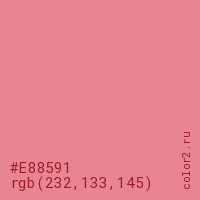 Цвет #E88591 в цветовой модели RGB обозначается тремя октетами (232, 133, 145) в десятичном формате и #E88591 в шестнадцатиричном (hex) формате, которые являются интенсивностью красного 232 (hex E8), интенсивность зелёного 133 (hex 85) и интенсивность синего 145 (hex 91).