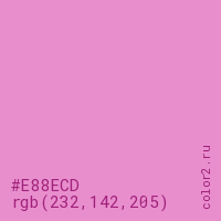 Цвет #E88ECD в цветовой модели RGB обозначается тремя октетами (232, 142, 205) в десятичном формате и #E88ECD в шестнадцатиричном (hex) формате, которые являются интенсивностью красного 232 (hex E8), интенсивность зелёного 142 (hex 8E) и интенсивность синего 205 (hex CD).