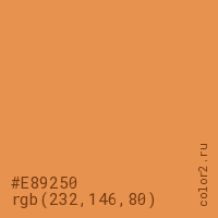 Цвет #E89250 в цветовой модели RGB обозначается тремя октетами (232, 146, 80) в десятичном формате и #E89250 в шестнадцатиричном (hex) формате, которые являются интенсивностью красного 232 (hex E8), интенсивность зелёного 146 (hex 92) и интенсивность синего 80 (hex 50).