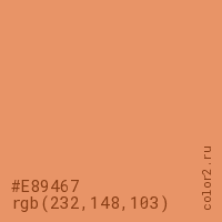 Цвет #E89467 в цветовой модели RGB обозначается тремя октетами (232, 148, 103) в десятичном формате и #E89467 в шестнадцатиричном (hex) формате, которые являются интенсивностью красного 232 (hex E8), интенсивность зелёного 148 (hex 94) и интенсивность синего 103 (hex 67).