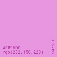 Цвет #E896DF в цветовой модели RGB обозначается тремя октетами (232, 150, 223) в десятичном формате и #E896DF в шестнадцатиричном (hex) формате, которые являются интенсивностью красного 232 (hex E8), интенсивность зелёного 150 (hex 96) и интенсивность синего 223 (hex DF).
