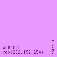 Цвет #E898FE в цветовой модели RGB обозначается тремя октетами (232, 152, 254) в десятичном формате и #E898FE в шестнадцатиричном (hex) формате, которые являются интенсивностью красного 232 (hex E8), интенсивность зелёного 152 (hex 98) и интенсивность синего 254 (hex FE).