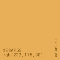 Цвет #E8AF58 в цветовой модели RGB обозначается тремя октетами (232, 175, 88) в десятичном формате и #E8AF58 в шестнадцатиричном (hex) формате, которые являются интенсивностью красного 232 (hex E8), интенсивность зелёного 175 (hex AF) и интенсивность синего 88 (hex 58).
