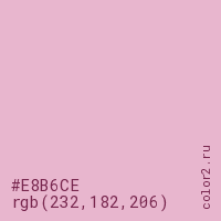 Цвет #E8B6CE в цветовой модели RGB обозначается тремя октетами (232, 182, 206) в десятичном формате и #E8B6CE в шестнадцатиричном (hex) формате, которые являются интенсивностью красного 232 (hex E8), интенсивность зелёного 182 (hex B6) и интенсивность синего 206 (hex CE).