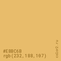Цвет #E8BC6B в цветовой модели RGB обозначается тремя октетами (232, 188, 107) в десятичном формате и #E8BC6B в шестнадцатиричном (hex) формате, которые являются интенсивностью красного 232 (hex E8), интенсивность зелёного 188 (hex BC) и интенсивность синего 107 (hex 6B).