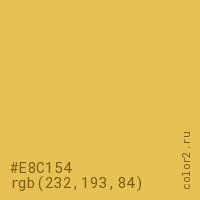 Цвет #E8C154 в цветовой модели RGB обозначается тремя октетами (232, 193, 84) в десятичном формате и #E8C154 в шестнадцатиричном (hex) формате, которые являются интенсивностью красного 232 (hex E8), интенсивность зелёного 193 (hex C1) и интенсивность синего 84 (hex 54).