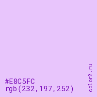Цвет #E8C5FC в цветовой модели RGB обозначается тремя октетами (232, 197, 252) в десятичном формате и #E8C5FC в шестнадцатиричном (hex) формате, которые являются интенсивностью красного 232 (hex E8), интенсивность зелёного 197 (hex C5) и интенсивность синего 252 (hex FC).