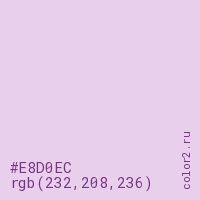 Цвет #E8D0EC в цветовой модели RGB обозначается тремя октетами (232, 208, 236) в десятичном формате и #E8D0EC в шестнадцатиричном (hex) формате, которые являются интенсивностью красного 232 (hex E8), интенсивность зелёного 208 (hex D0) и интенсивность синего 236 (hex EC).
