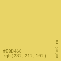 Цвет #E8D466 в цветовой модели RGB обозначается тремя октетами (232, 212, 102) в десятичном формате и #E8D466 в шестнадцатиричном (hex) формате, которые являются интенсивностью красного 232 (hex E8), интенсивность зелёного 212 (hex D4) и интенсивность синего 102 (hex 66).