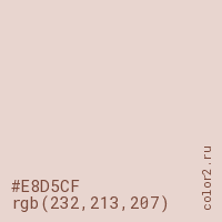 Цвет #E8D5CF в цветовой модели RGB обозначается тремя октетами (232, 213, 207) в десятичном формате и #E8D5CF в шестнадцатиричном (hex) формате, которые являются интенсивностью красного 232 (hex E8), интенсивность зелёного 213 (hex D5) и интенсивность синего 207 (hex CF).