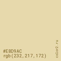 Цвет RGB(232, 217, 172) в процентом отношении количества цвета состоит из 91% красного (red), 85.1% зелёного (green) и 67.5% синего (blue).