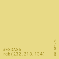 Цвет #E8DA86 в цветовой модели RGB обозначается тремя октетами (232, 218, 134) в десятичном формате и #E8DA86 в шестнадцатиричном (hex) формате, которые являются интенсивностью красного 232 (hex E8), интенсивность зелёного 218 (hex DA) и интенсивность синего 134 (hex 86).