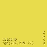 Цвет #E8DB4D в цветовой модели RGB обозначается тремя октетами (232, 219, 77) в десятичном формате и #E8DB4D в шестнадцатиричном (hex) формате, которые являются интенсивностью красного 232 (hex E8), интенсивность зелёного 219 (hex DB) и интенсивность синего 77 (hex 4D).