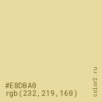 Цвет #E8DBA0 в цветовой модели RGB обозначается тремя октетами (232, 219, 160) в десятичном формате и #E8DBA0 в шестнадцатиричном (hex) формате, которые являются интенсивностью красного 232 (hex E8), интенсивность зелёного 219 (hex DB) и интенсивность синего 160 (hex A0).