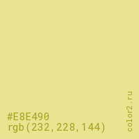 Цвет #E8E490 в цветовой модели RGB обозначается тремя октетами (232, 228, 144) в десятичном формате и #E8E490 в шестнадцатиричном (hex) формате, которые являются интенсивностью красного 232 (hex E8), интенсивность зелёного 228 (hex E4) и интенсивность синего 144 (hex 90).