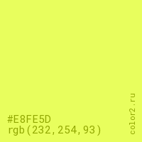 Цвет #E8FE5D в цветовой модели RGB обозначается тремя октетами (232, 254, 93) в десятичном формате и #E8FE5D в шестнадцатиричном (hex) формате, которые являются интенсивностью красного 232 (hex E8), интенсивность зелёного 254 (hex FE) и интенсивность синего 93 (hex 5D).