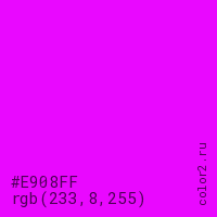 Цвет #E908FF в цветовой модели RGB обозначается тремя октетами (233, 8, 255) в десятичном формате и #E908FF в шестнадцатиричном (hex) формате, которые являются интенсивностью красного 233 (hex E9), интенсивность зелёного 8 (hex 08) и интенсивность синего 255 (hex FF).