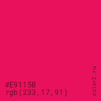 Цвет #E9115B в цветовой модели RGB обозначается тремя октетами (233, 17, 91) в десятичном формате и #E9115B в шестнадцатиричном (hex) формате, которые являются интенсивностью красного 233 (hex E9), интенсивность зелёного 17 (hex 11) и интенсивность синего 91 (hex 5B).