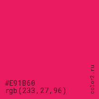 Цвет #E91B60 в цветовой модели RGB обозначается тремя октетами (233, 27, 96) в десятичном формате и #E91B60 в шестнадцатиричном (hex) формате, которые являются интенсивностью красного 233 (hex E9), интенсивность зелёного 27 (hex 1B) и интенсивность синего 96 (hex 60).