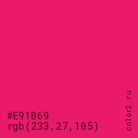 Цвет #E91B69 в цветовой модели RGB обозначается тремя октетами (233, 27, 105) в десятичном формате и #E91B69 в шестнадцатиричном (hex) формате, которые являются интенсивностью красного 233 (hex E9), интенсивность зелёного 27 (hex 1B) и интенсивность синего 105 (hex 69).