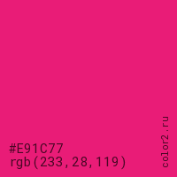 Цвет #E91C77 в цветовой модели RGB обозначается тремя октетами (233, 28, 119) в десятичном формате и #E91C77 в шестнадцатиричном (hex) формате, которые являются интенсивностью красного 233 (hex E9), интенсивность зелёного 28 (hex 1C) и интенсивность синего 119 (hex 77).