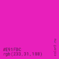 Цвет #E91FBC в цветовой модели RGB обозначается тремя октетами (233, 31, 188) в десятичном формате и #E91FBC в шестнадцатиричном (hex) формате, которые являются интенсивностью красного 233 (hex E9), интенсивность зелёного 31 (hex 1F) и интенсивность синего 188 (hex BC).