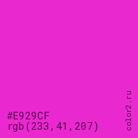 Цвет #E929CF в цветовой модели RGB обозначается тремя октетами (233, 41, 207) в десятичном формате и #E929CF в шестнадцатиричном (hex) формате, которые являются интенсивностью красного 233 (hex E9), интенсивность зелёного 41 (hex 29) и интенсивность синего 207 (hex CF).