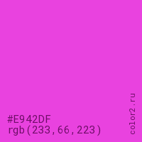 Цвет #E942DF в цветовой модели RGB обозначается тремя октетами (233, 66, 223) в десятичном формате и #E942DF в шестнадцатиричном (hex) формате, которые являются интенсивностью красного 233 (hex E9), интенсивность зелёного 66 (hex 42) и интенсивность синего 223 (hex DF).