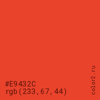 Цвет #E9432C в цветовой модели RGB обозначается тремя октетами (233, 67, 44) в десятичном формате и #E9432C в шестнадцатиричном (hex) формате, которые являются интенсивностью красного 233 (hex E9), интенсивность зелёного 67 (hex 43) и интенсивность синего 44 (hex 2C).