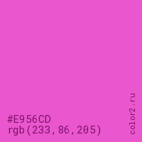 Цвет #E956CD в цветовой модели RGB обозначается тремя октетами (233, 86, 205) в десятичном формате и #E956CD в шестнадцатиричном (hex) формате, которые являются интенсивностью красного 233 (hex E9), интенсивность зелёного 86 (hex 56) и интенсивность синего 205 (hex CD).