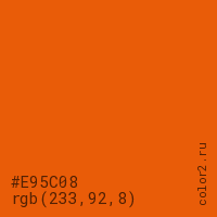 Цвет #E95C08 в цветовой модели RGB обозначается тремя октетами (233, 92, 8) в десятичном формате и #E95C08 в шестнадцатиричном (hex) формате, которые являются интенсивностью красного 233 (hex E9), интенсивность зелёного 92 (hex 5C) и интенсивность синего 8 (hex 08).
