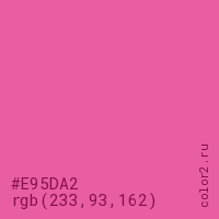 Цвет #E95DA2 в цветовой модели RGB обозначается тремя октетами (233, 93, 162) в десятичном формате и #E95DA2 в шестнадцатиричном (hex) формате, которые являются интенсивностью красного 233 (hex E9), интенсивность зелёного 93 (hex 5D) и интенсивность синего 162 (hex A2).