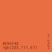 Цвет #E96F43 в цветовой модели RGB обозначается тремя октетами (233, 111, 67) в десятичном формате и #E96F43 в шестнадцатиричном (hex) формате, которые являются интенсивностью красного 233 (hex E9), интенсивность зелёного 111 (hex 6F) и интенсивность синего 67 (hex 43).
