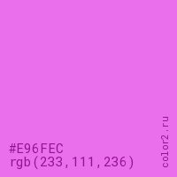 Цвет #E96FEC в цветовой модели RGB обозначается тремя октетами (233, 111, 236) в десятичном формате и #E96FEC в шестнадцатиричном (hex) формате, которые являются интенсивностью красного 233 (hex E9), интенсивность зелёного 111 (hex 6F) и интенсивность синего 236 (hex EC).