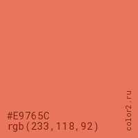 Цвет #E9765C в цветовой модели RGB обозначается тремя октетами (233, 118, 92) в десятичном формате и #E9765C в шестнадцатиричном (hex) формате, которые являются интенсивностью красного 233 (hex E9), интенсивность зелёного 118 (hex 76) и интенсивность синего 92 (hex 5C).