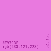 Цвет #E979DF в цветовой модели RGB обозначается тремя октетами (233, 121, 223) в десятичном формате и #E979DF в шестнадцатиричном (hex) формате, которые являются интенсивностью красного 233 (hex E9), интенсивность зелёного 121 (hex 79) и интенсивность синего 223 (hex DF).